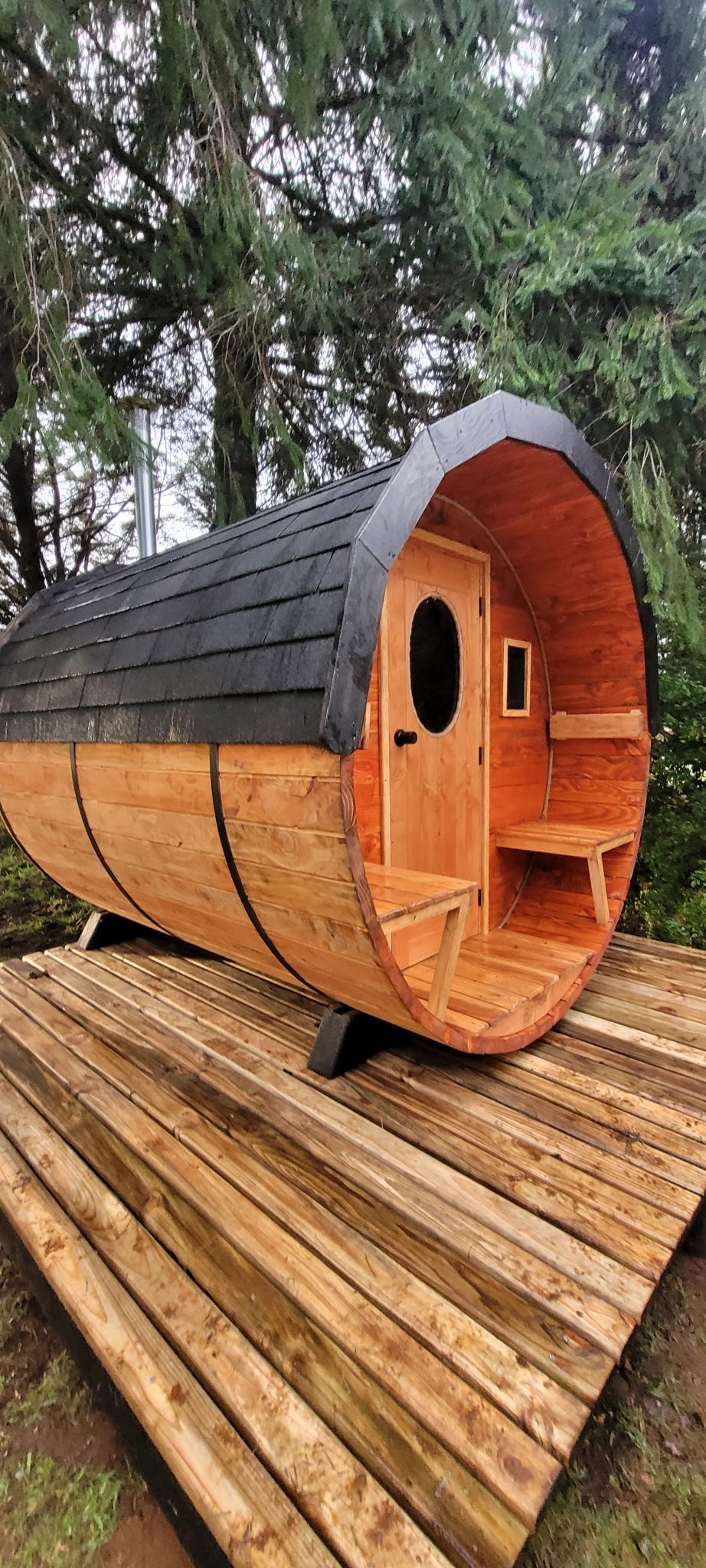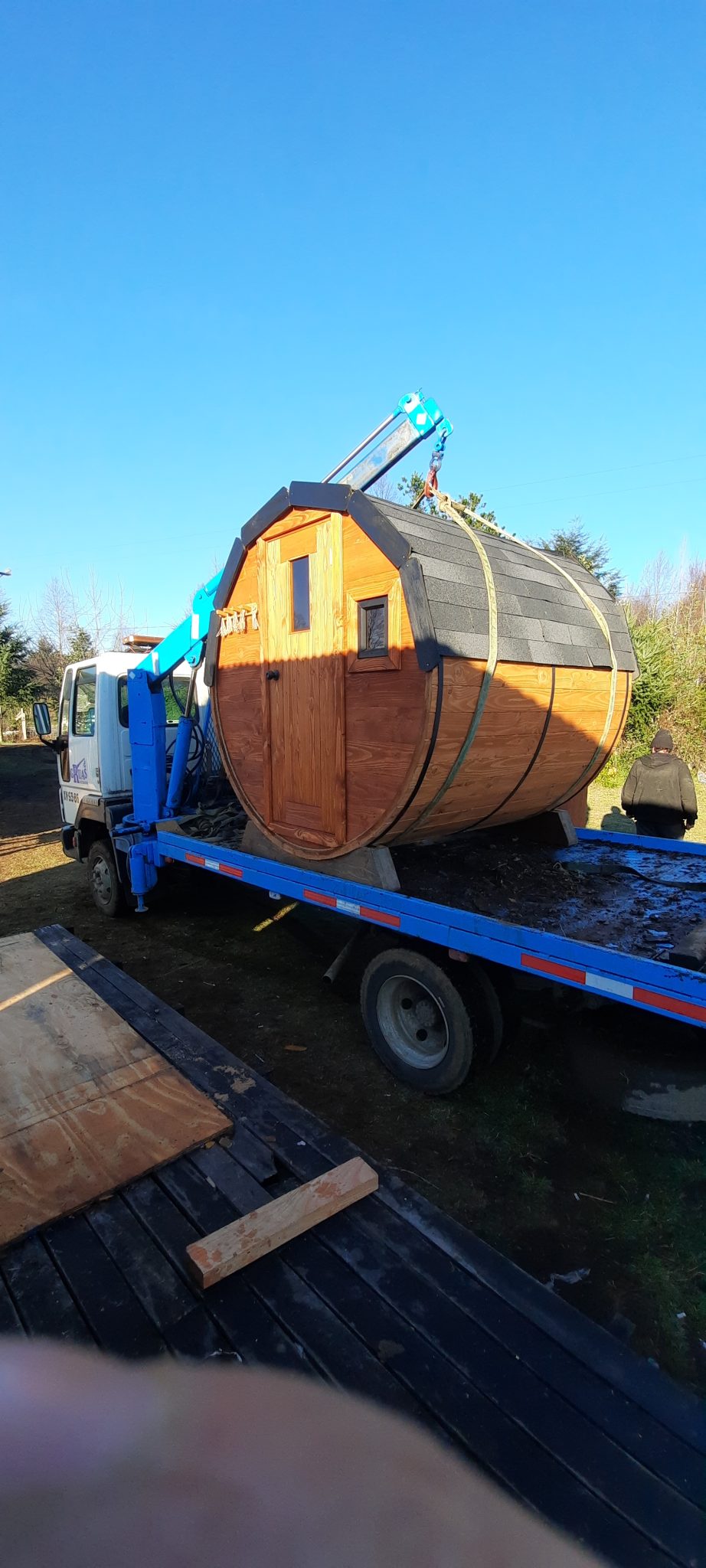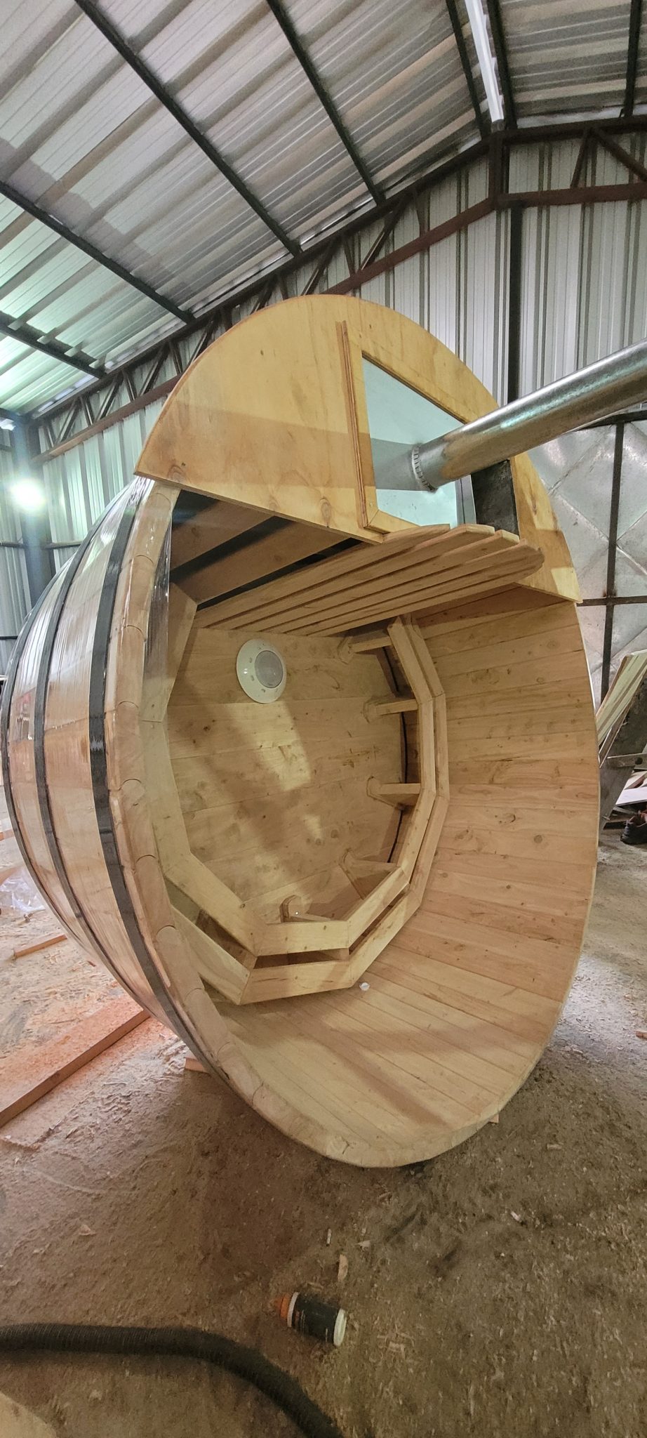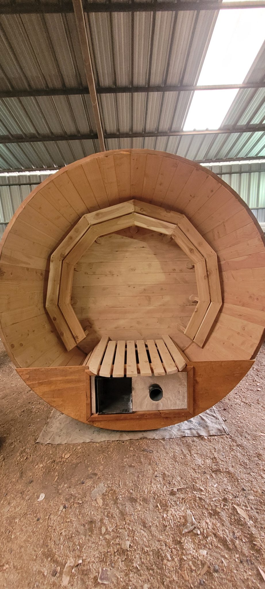 Sauna estilo barril elaborada en Oregón o Ciprés 2.0 mts. de diámetro por 2.60 mts. de largo, capacidad 6 personas.