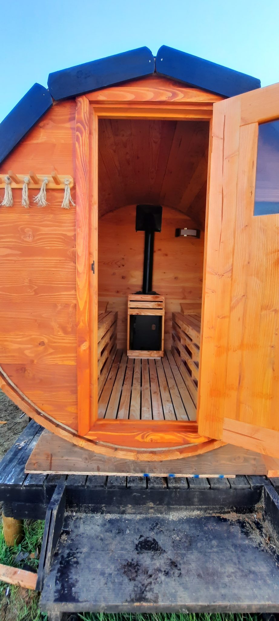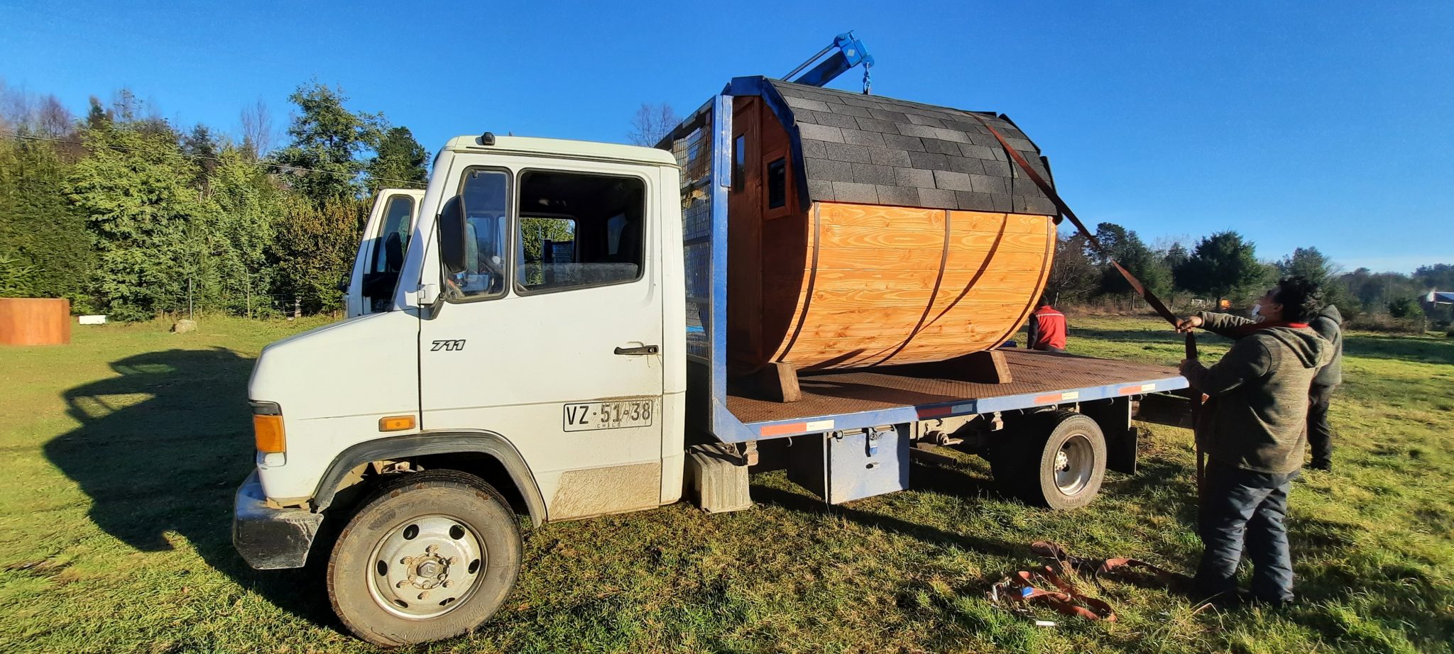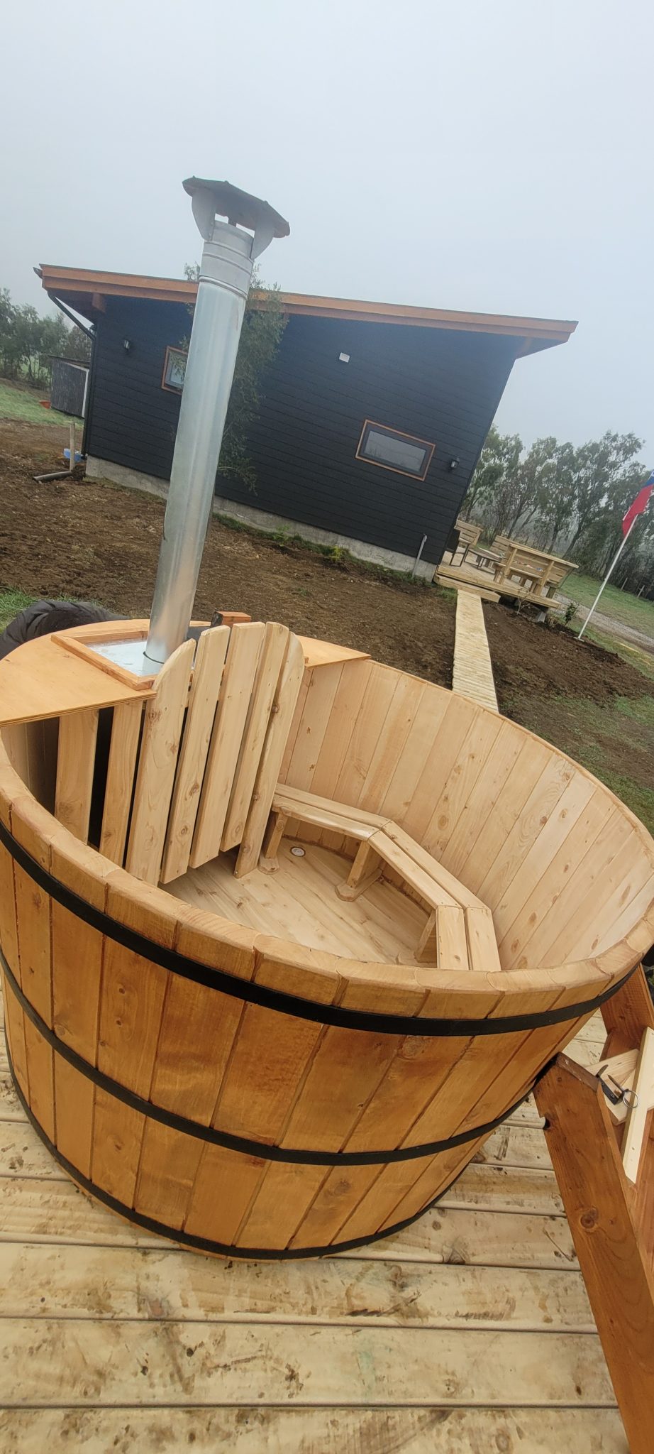Sauna estilo barril elaborada en Oregón o Ciprés 2.0 mts. de diámetro por 2.60 mts. de largo, capacidad 6 personas.