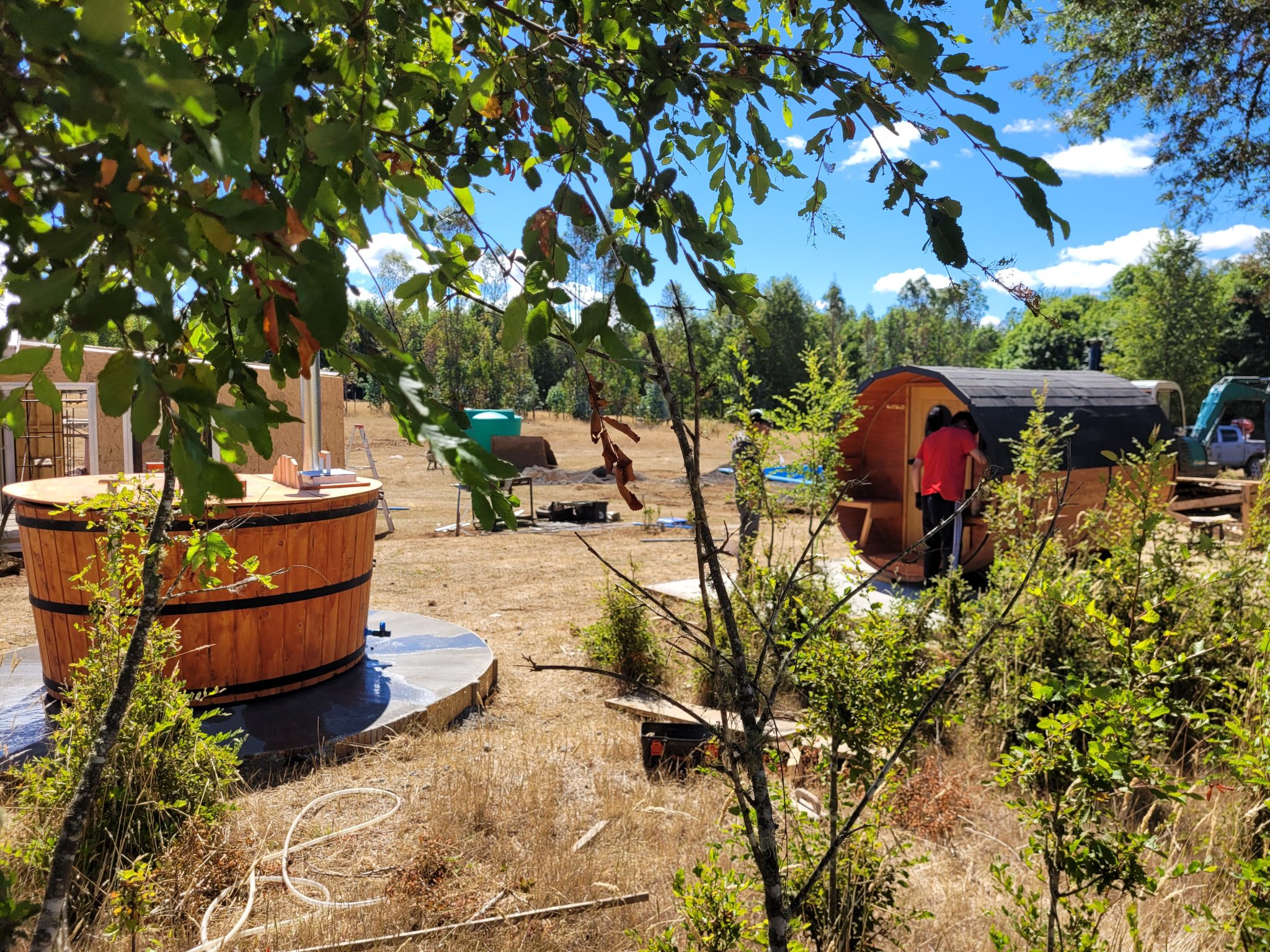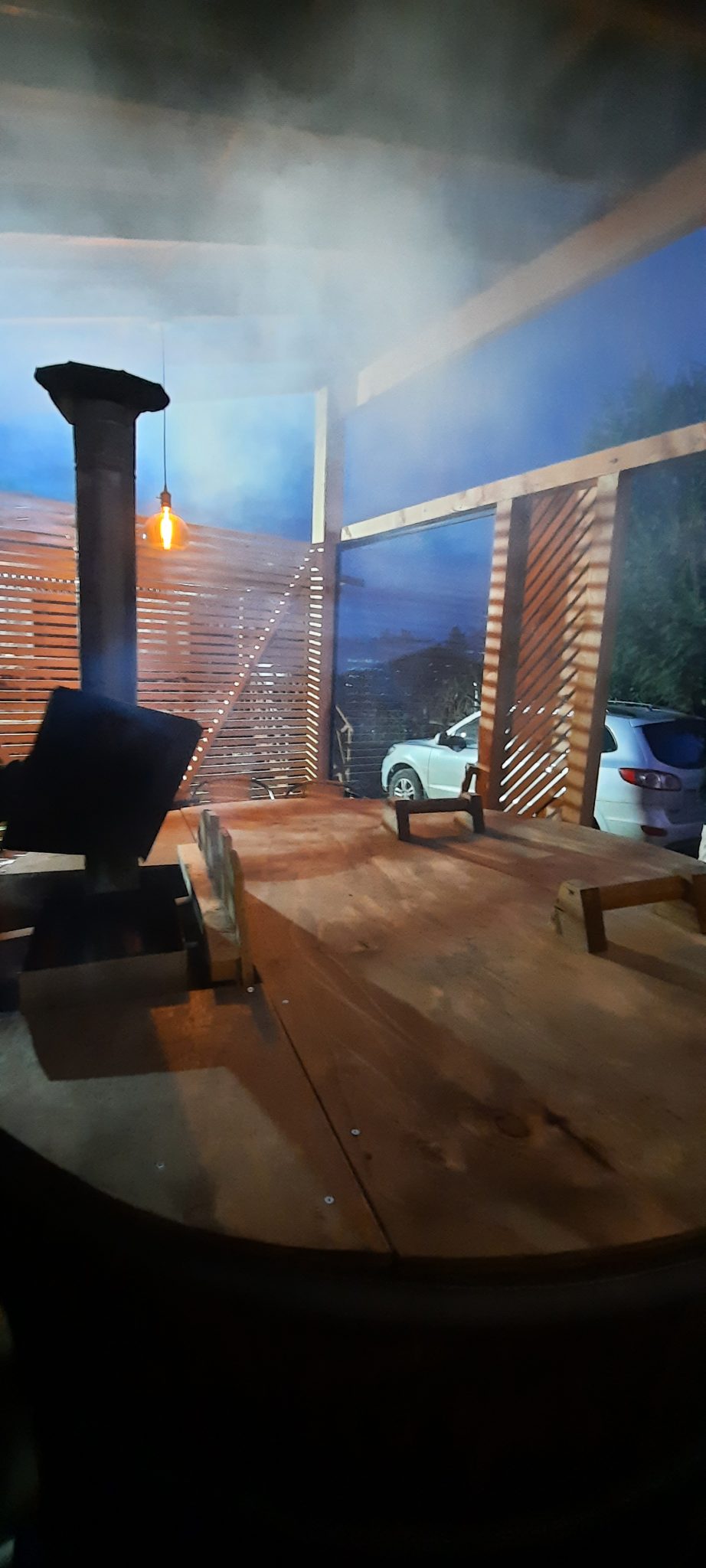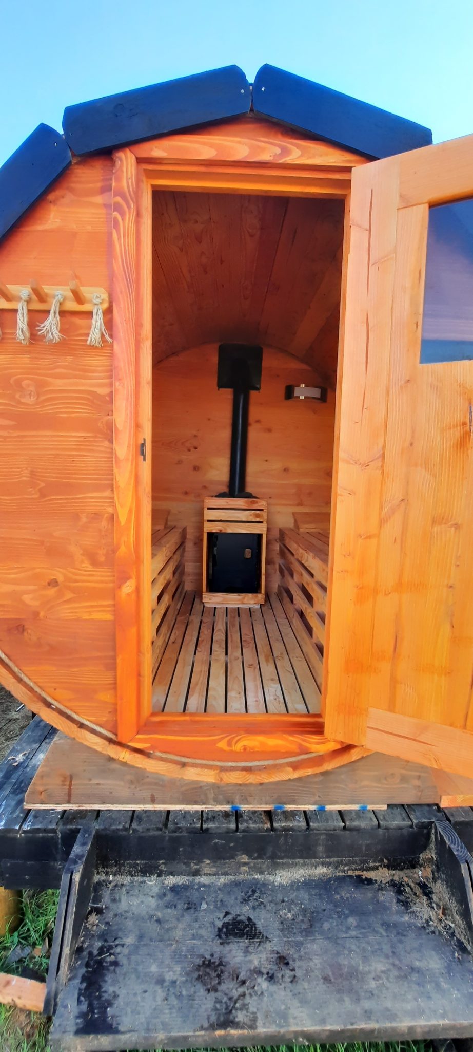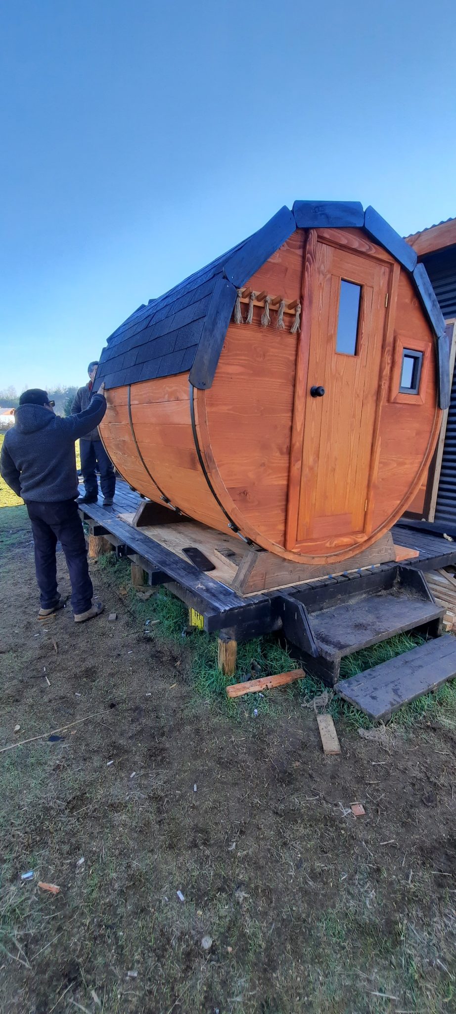 Sauna estilo barril elaborada en Oregón o Ciprés 2.0 mts. de diámetro por 2.60 mts. de largo, capacidad 6 personas.