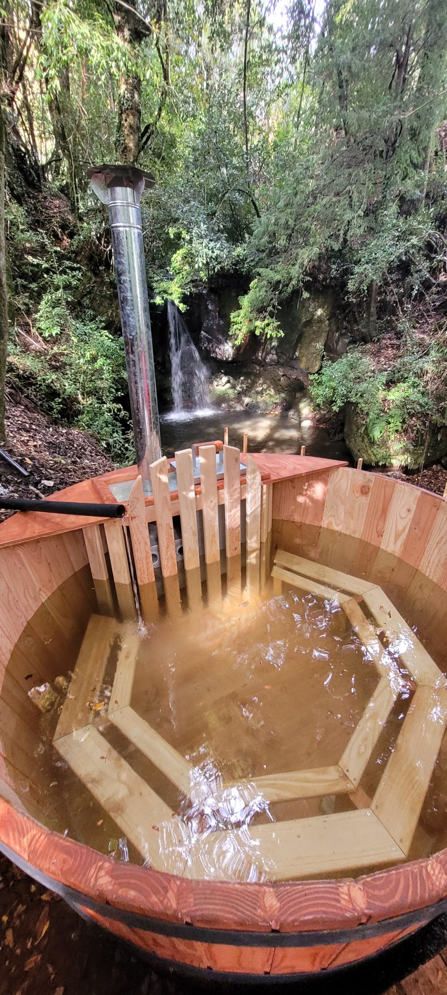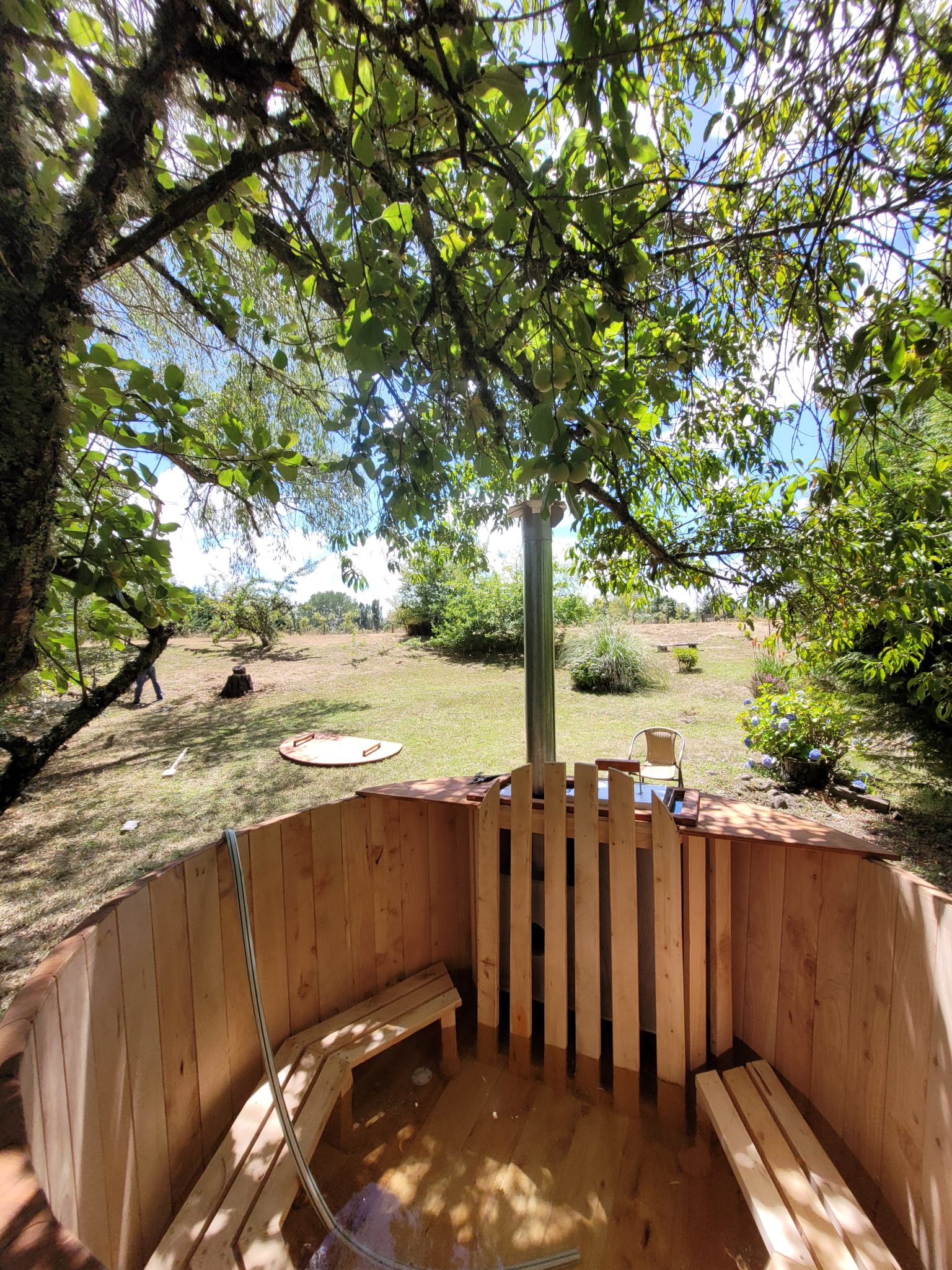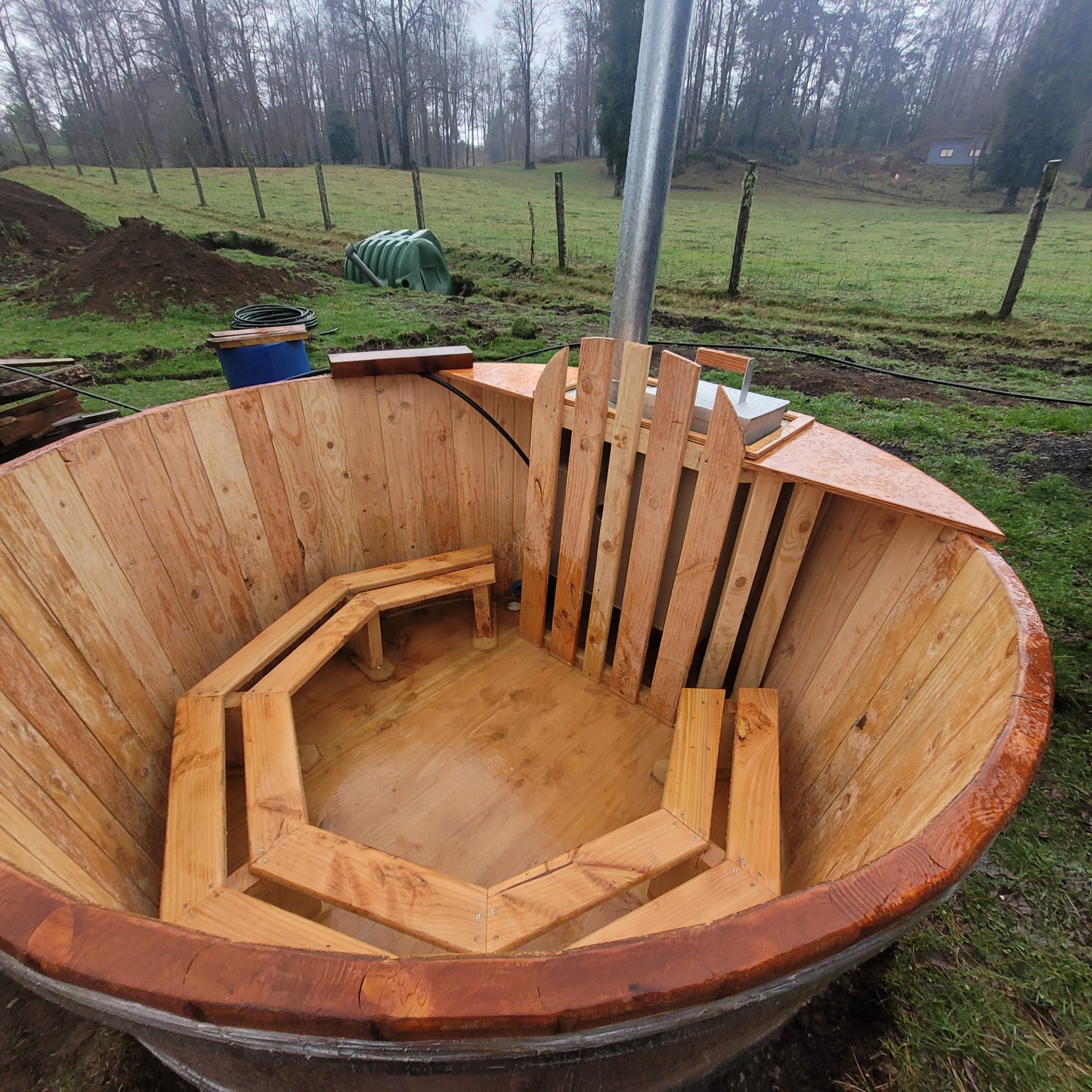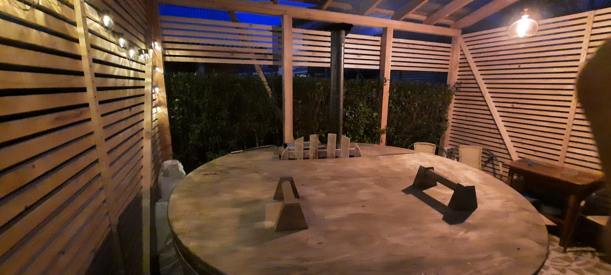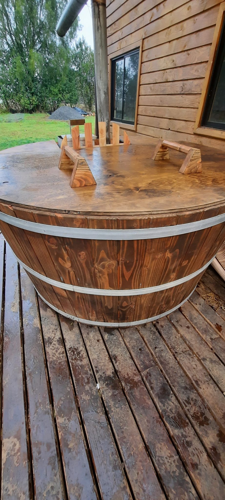 Tinaja cónica elaborada en madera de Oregón o Ciprés 2.20 mts. de diámetro, capacidad 8 personas.
