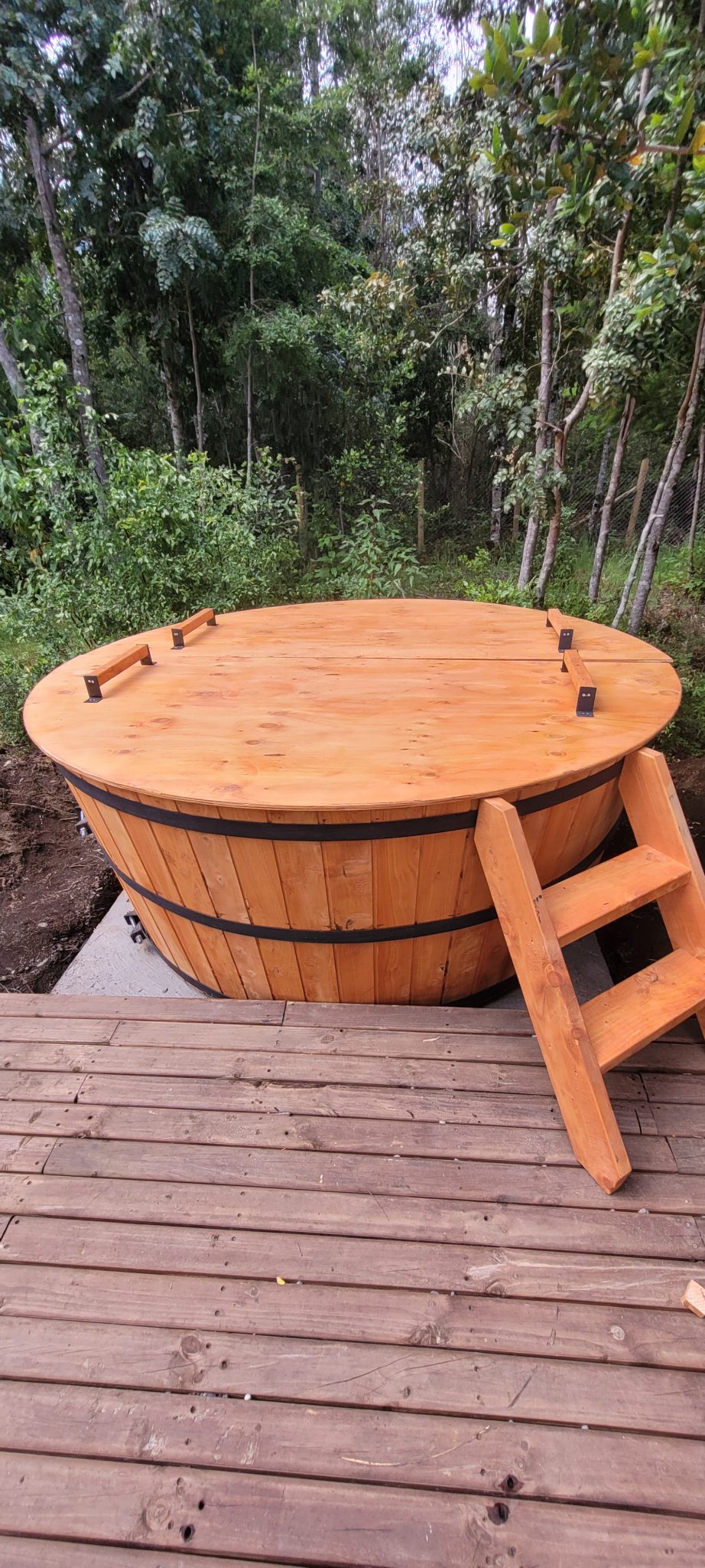 Tinaja cónica elaborada en madera de Oregón o Ciprés 1.90 mts. de diámetro, capacidad 6 personas.